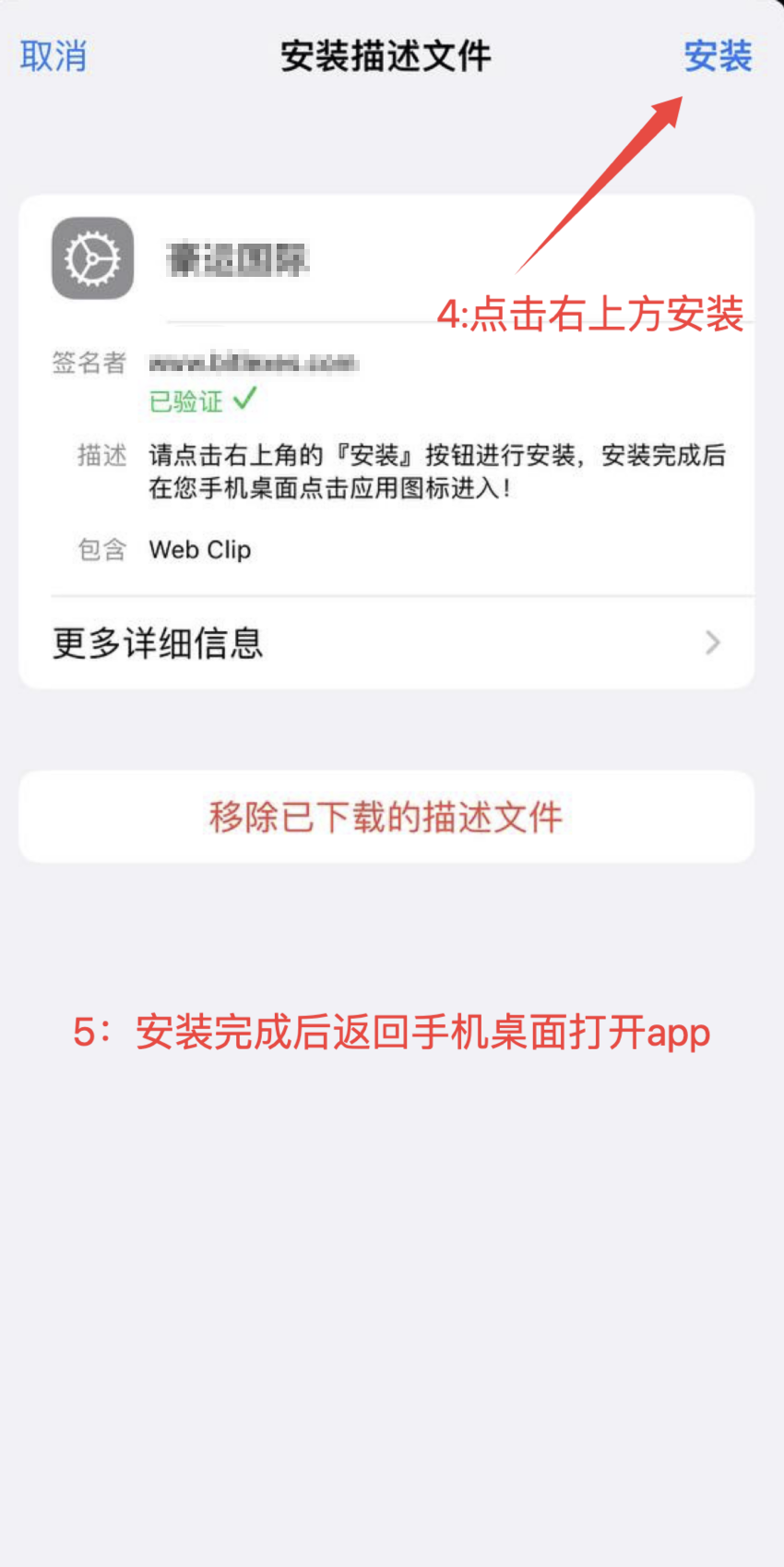 《点击下载描述文件—点击允许—请手动打开 系统设置—通用—vpn与设备管理—点击已下载描述文件—右上角选择安装》